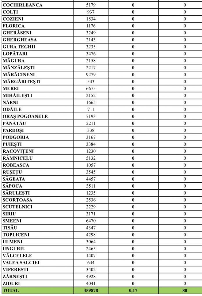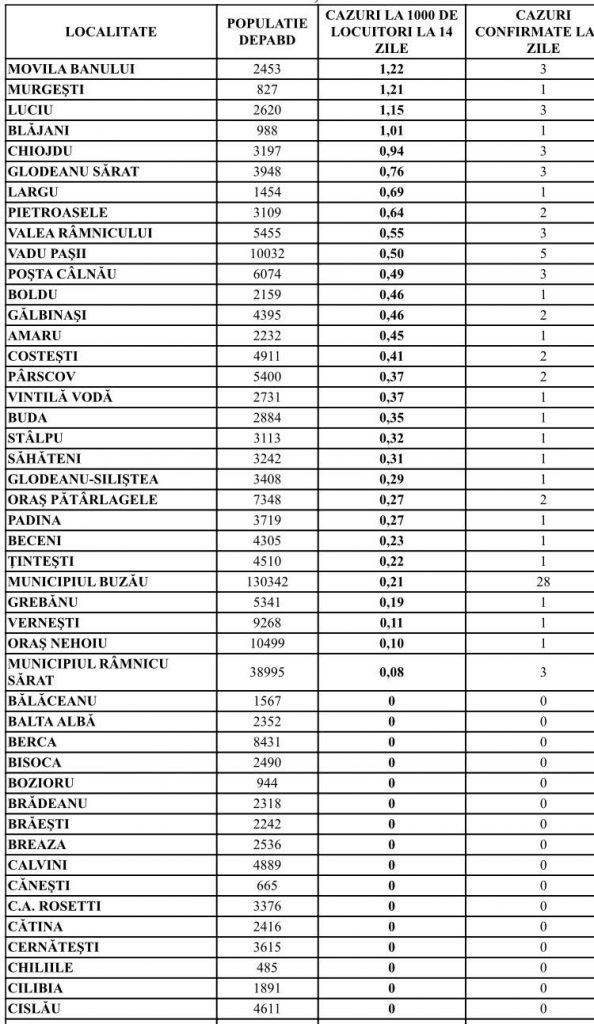 Iată lista cu rata de incidența a infectării cu COVID-19 cumulată la 14 zile, la nivelul localităților din județul Buzău: