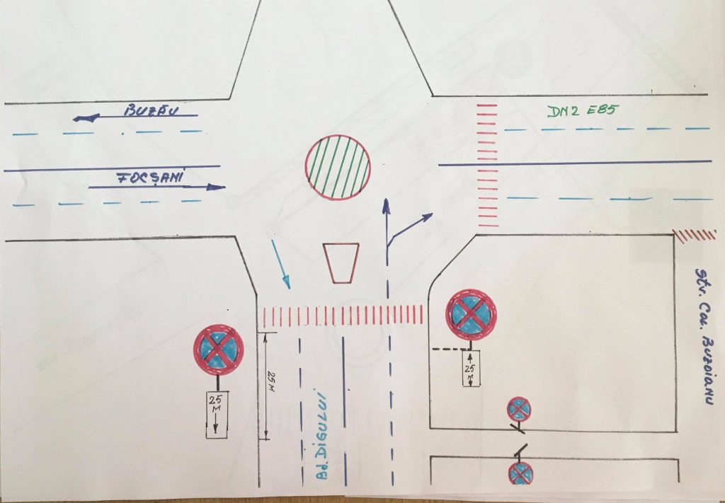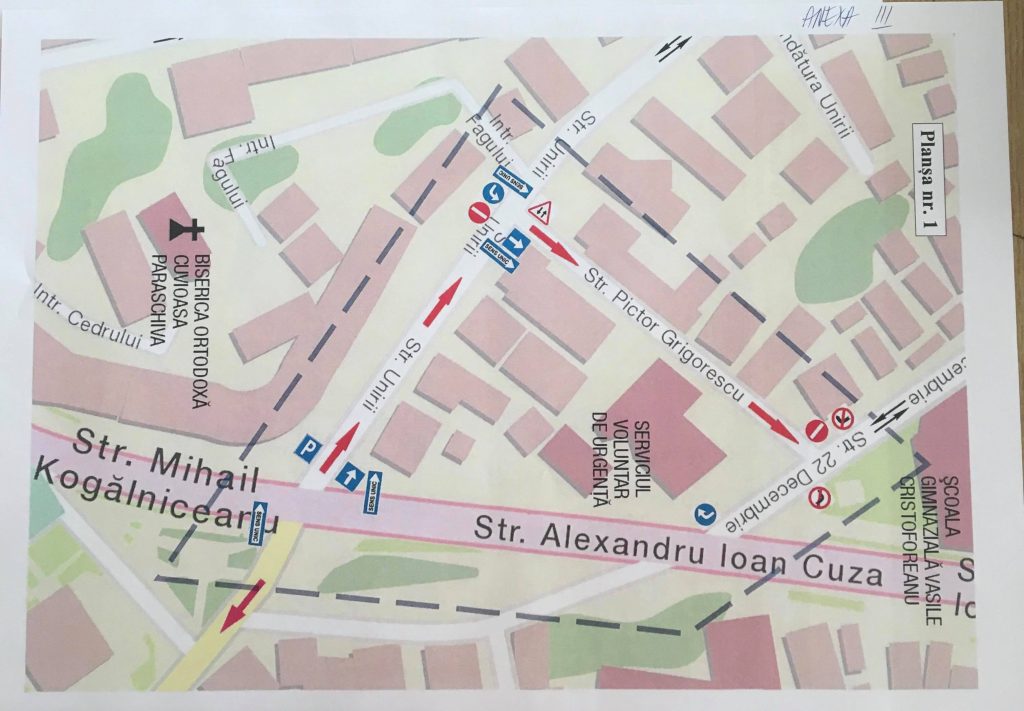La intersecția drumului European DN2 E85 cu strada Unirii, se va monta indicator cu semnificația SENS UNIC, totodată la intersecția străzii Unirii cu strada Pictor Grigorescu, se va monta indicator cu semnificația SENS UNIC, iar la intersecția străzii Unirii cu strada Pictor Grigorescu, cu sens de circulație dinspre strada 9 Mai, se va monta indicator cu semnificația Accesul Interzis.