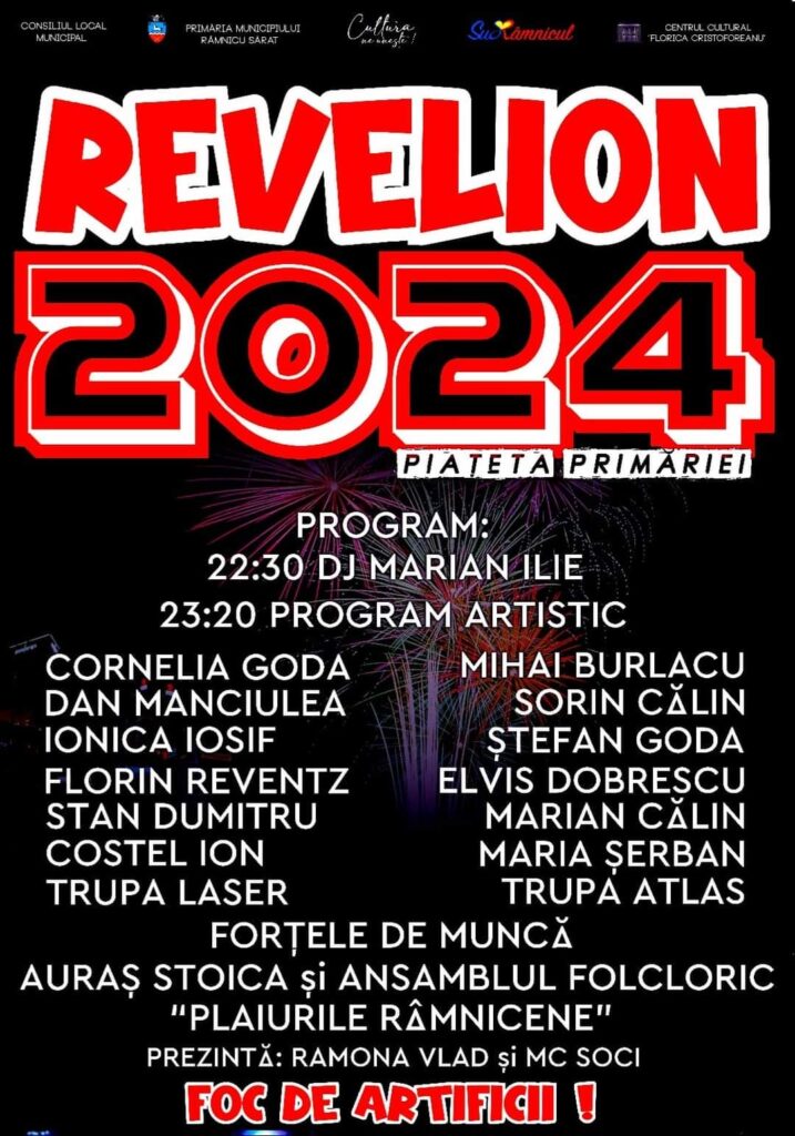 Evenimentul va include, la miezul nopții, și un spectaculos foc de artificii, iar după ora 24:00, pe scenă vor evolua artiști râmniceni, precum Cornelia Goda, Dan Manciulea, Ionica Iosif, Florin Reventz, Stan Dumitru, Costel Ion, Mihai Burlacu, Sorin Călin, Ștefan Goda, Marian Călin, Maria Șerban și Elvis Dobrescu.