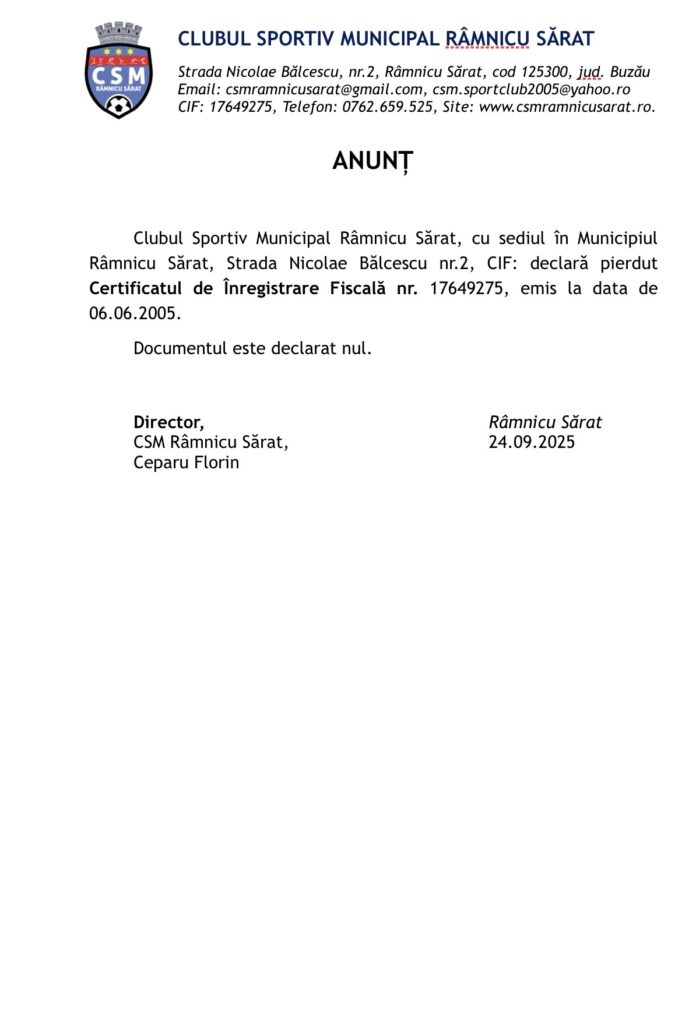 Clubul Sportiv Municipal Râmnicu Sărat, cu sediul în Municipiul Râmnicu Sărat, Strada Nicolae Bălcescu nr.2, CIF: declară pierdut Certificatul de Înregistrare Fiscală nr. 17649275, emis la data de 06.06.2005.